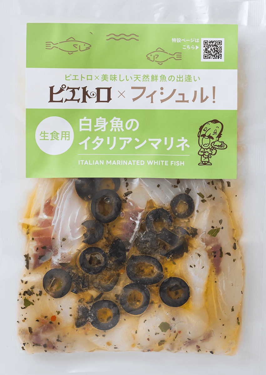 生食用九州産の白身魚をバジルで香り豊かに仕上げたイタリアンドレッシングで味付けしたカルパッチョ。
