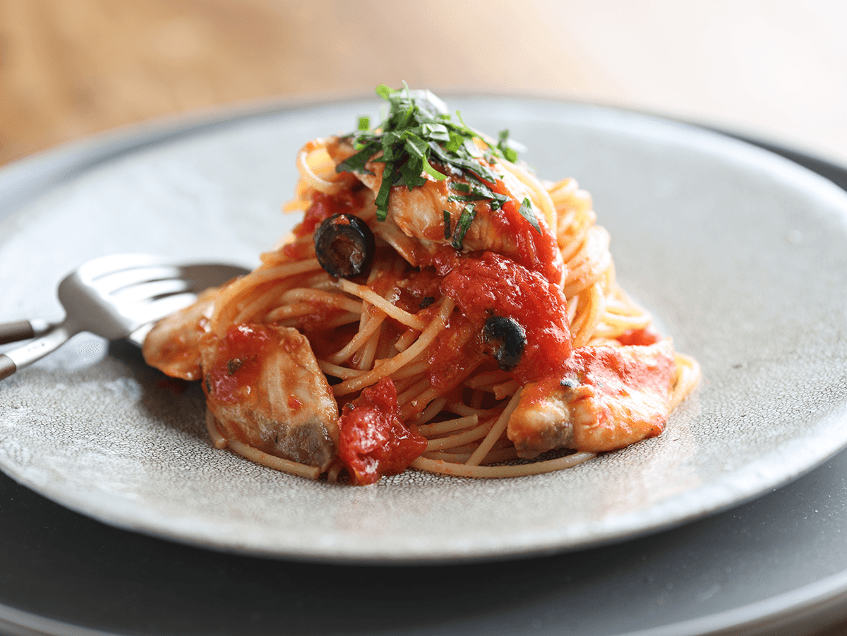 「白身魚のイタリアンマリネ」1袋と、パスタ麺と市販のトマトソースがあれば作れるお手軽スパゲティ。