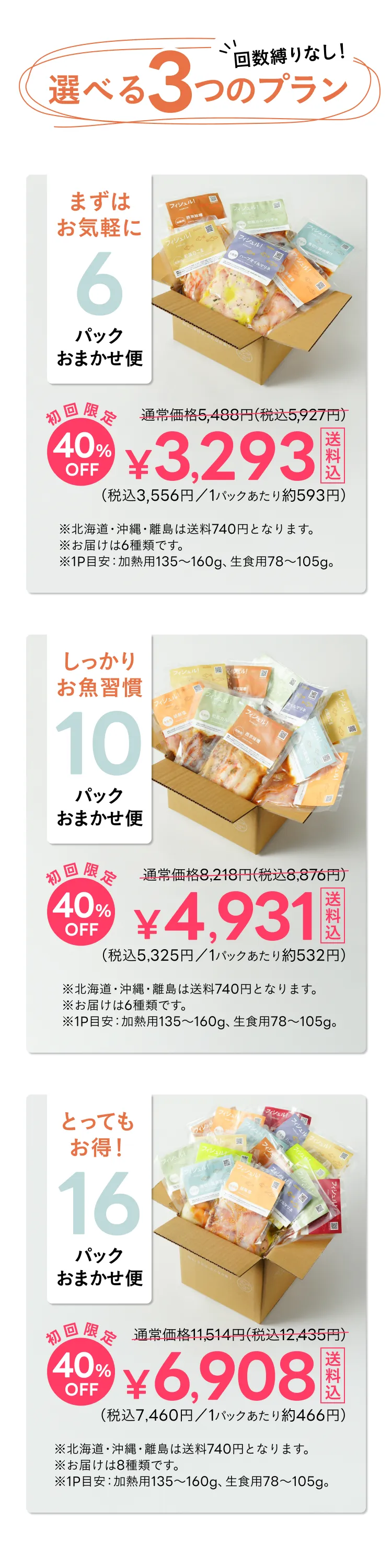 その時期に旬の魚を買い付け、その魚種にあった最適な味付けをお届けするため、基本的に魚種をお選びいただくことはできません。マイページからのお手続きで、今後送られる味付けをカスタマイズすることができます。また別途アレルギーがある場合には、お問い合わせいただければ対応させていただきます。
