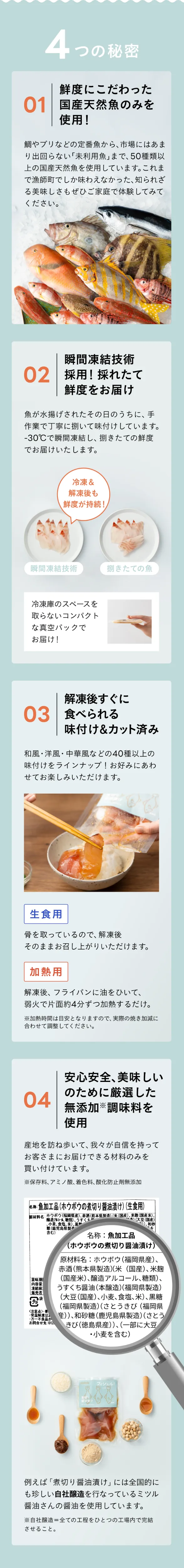 その時期に旬の魚を買い付け、その魚種にあった最適な味付けをお届けするため、基本的に魚種をお選びいただくことはできません。マイページからのお手続きで、今後送られる味付けをカスタマイズすることができます。また別途アレルギーがある場合には、お問い合わせいただければ対応させていただきます。